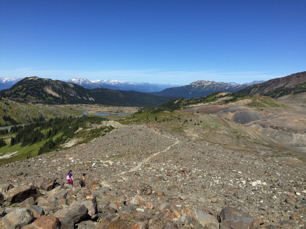 Image of the trail down from Panorama Ridge in Garibaldi Provincial Park in BC. Hikers can be seen walking down the trail.